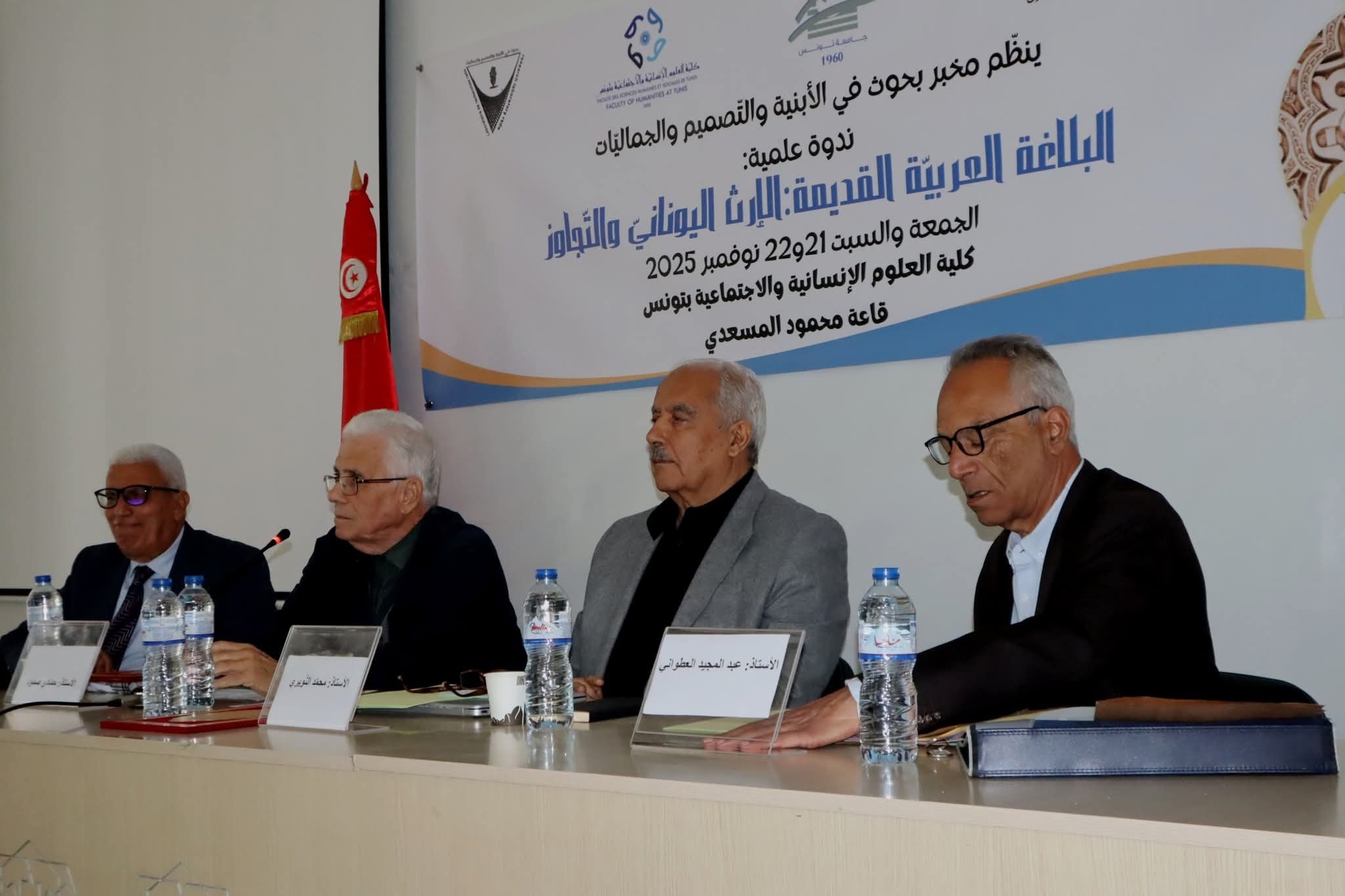 اختتم  مخبر بحوث في الأبنية والتصميم والجماليات مؤخرا، أشغال ندوته العلمية الدولية حول البلاغة العربية القديمة: الإرث اليوناني القديم، المنتظمة يومي 21 و 22 نوفمبر 2025  بكلية العلوم الإنسانية والاجتماعية بتونس (قاعة محمود المسعدي).